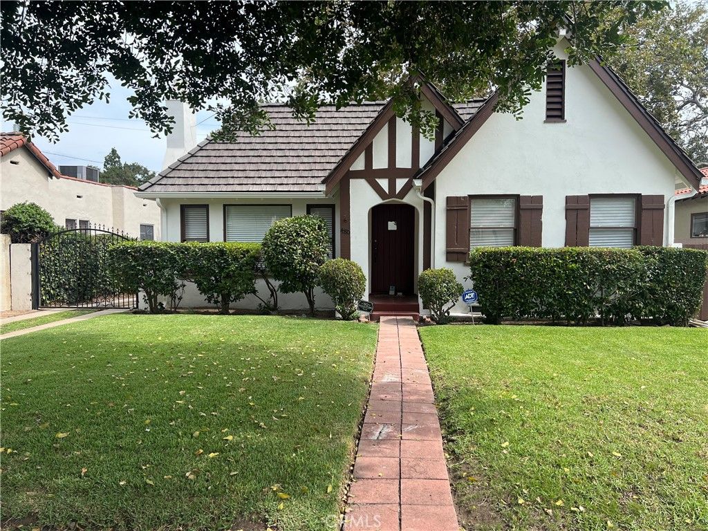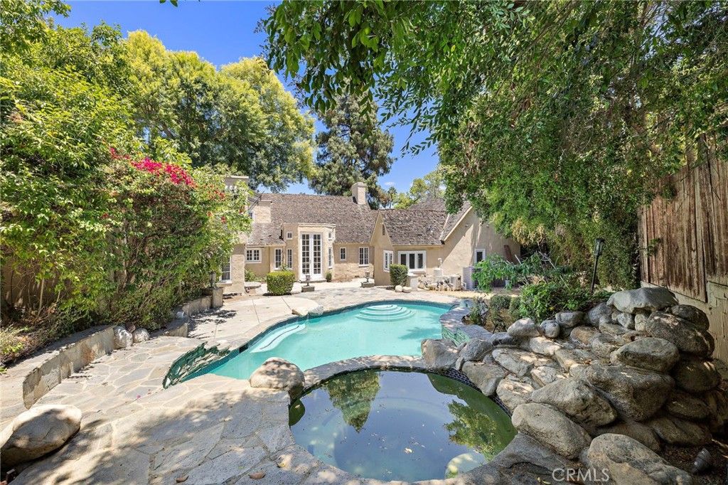 Nestled on a quiet street in San Marino's highly desirable Mission District, this English Cottage evokes the timeless charm of the countryside. With its steeply pitched roof, aged brick facade, and diamond-pane windows, the home radiates warmth and storybook appeal. A paver stone walkway meanders through lush flower beds to the inviting porch featuring arched wood beams that accent a vintage paneled door create a welcoming prelude to the home. Beyond the entry, built-in shelves and a petite view window lead into the dramatic living room, revealing soaring vaulted ceilings with exposed beams, gleaming hardwood floors, anchored by a striking stone fireplace with raised hearth and rustic wood mantel. A French door opens to the side patio, blending indoor and outdoor living. The formal dining room, illuminated by an opaque glass chandelier and abundant natural light, opens to the sunny breakfast room featuring a wrought-iron chandelier adorned with hand-painted ceramic accents, walls of cabinetry, a convenient prep sink, and a tiled serving counter that connects seamlessly to the kitchen--perfect for casual meals or morning coffee. The functional kitchen is appointed with tiled countertop, matching backsplash, and custom cabinetry. A versatile mudroom with laundry and an adjoining three-quarter bath adds everyday convenience, while a side door opens to the paver driveway that leads to the detached garage. A central hallway leads to the home's private quarters, where one bedroom features a walk-in closet and French doors to the side patio. At the end of the hall, a flexible primary suite can be closed off for added privacy and offers double closets, tranquil views of the backyard, and a primary bath with dual sinks. A third bedroom doubles as an office or den, enhanced by built-in bookcases and French doors that open to a wisteria-draped pergola--an enchanting setting for dining al fresco. The private backyard unfolds as an oasis of relaxation and leisure, with a sparkling pool surrounded by lush hedges and mature trees, offering the perfect retreat for lounging by the water or gathering with friends on warm evenings. Combining classic English charm with the best of California living, this quintessential cottage is truly your home sweet home!